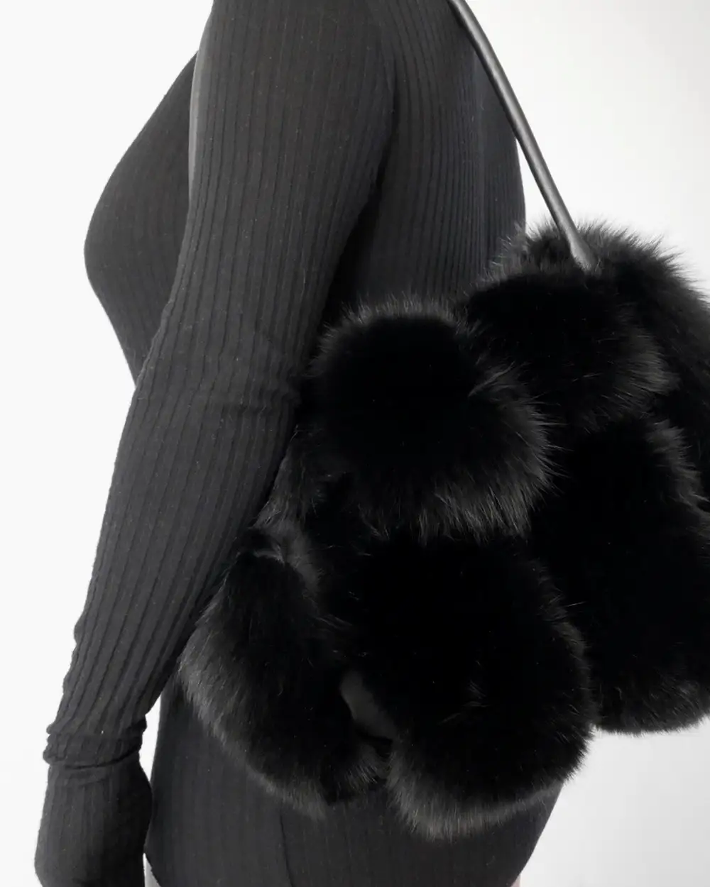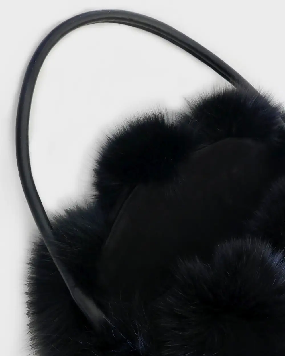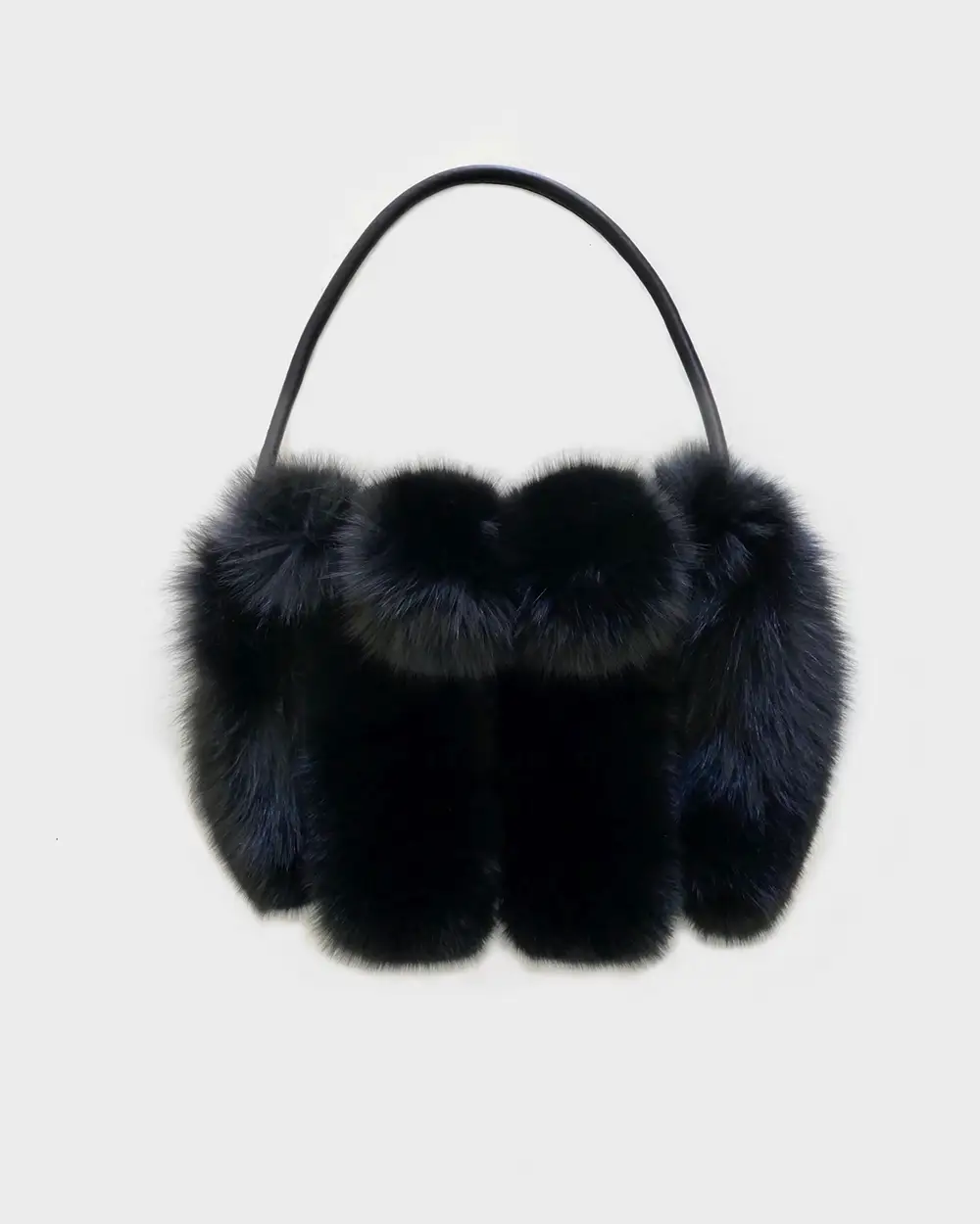 Paneled Silver Fox fur, black suede, waxed cowhide leather rolled handle, welt pocket detail with silk pocket lining